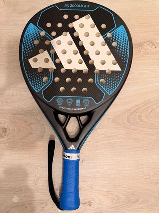Pala de pádel Adidas Rx 2000 Light en color negro y azul. - Diseño con el logo de Adidas. - Superficie con agujeros. - Empuñadura azul. - Cuerda de seguridad negra.