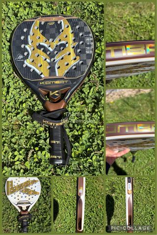 Pala de pádel Kombat con un diseño llamativo en negro y dorado. - Superficie rugosa. - Grip negro con logo. - Protector en el marco. - En su caja. - La use en 3 partidos. Con formato diamante y balance alto, la Xifos V2 incorpora materiales de última generación que ofrecen un rendimiento único. Su gran novedad son sus dos caras diferenciadas: Una con carbono 18K, para tu lado más estratega, con excelente control y salida de bola. Otra con carbono 12K, para tu lado más agresivo, con la máxima potencia. Más especificaciones en la web.
