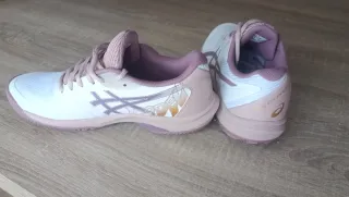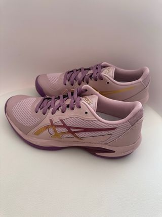 Zapatillas de pádel Asics en color rosa palo con detalles en morado y dorado. Nuevas valen 120€. Están sin estrenar. Talla 38.