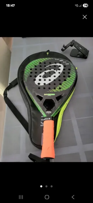 Pala de pádel Asics Hybrid 3 en color negro y verde. Muy poco uso. - Diseño con el logo de Asics. - Agarre con correa de seguridad. - Superficie con agujeros. - Detalles en verde neón.