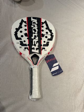Pala de pádel Babolat Vertuo con diseño moderno y llamativo. - Pala de pádel Babolat. - Modelo Vertuo. - Color blanco con detalles en negro y rojo. - Incluye funda.