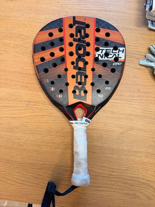 Pala de pádel Babolat Technical Viper con 1 año y medio de uso. Diseño en color naranja y negro. - Marco con protector. - Superficie con agujeros. - Empuñadura con overgrip.