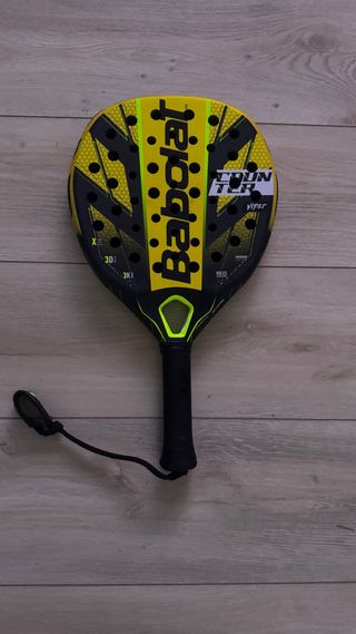 Pala de pádel de la marca Babolat. Tiene algunos roces en el marco y una pequeña reparación en uno de los planos. Incluye hesacore.