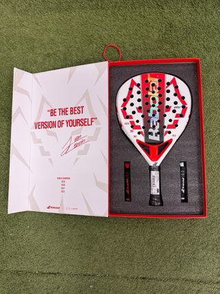 Pala de pádel Babolat Viper Juan Lebrón 3.0. - Diseño en color rojo con detalles plateados y holográficos. - Incluye funda protectora. - Modelo JL 3.0. Ganada en un torneo