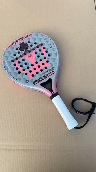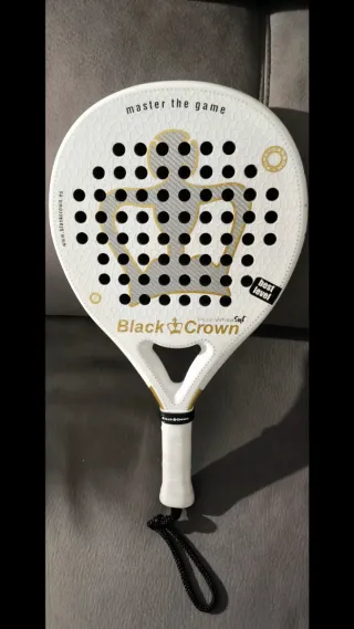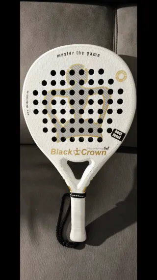 Pala de pádel Black Crown en color blanco y acabado soft lo único que tiene es un salto de pintura xq se me cayo la pala ( se ve en la última foto ) Diseñada para un juego cómodo y con buen control. - Diseño con corona y detalles dorados. - Superficie con agujeros. - Incluye cordón de seguridad. - Logo de Black Crown en el puño.