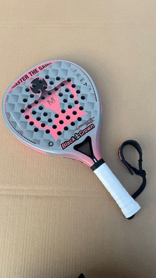 Pala de pádel Black Crown con diseño moderno y llamativo. - Color principal gris con detalles en rosa. - Incluye correa de seguridad. - Logo de Black Crown visible. - incluye la funda
