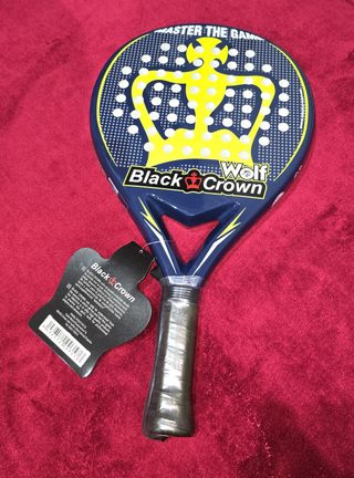 La pala de pádel Black Crown Wolf es una pala de control pensada para jugadores principiantes e intermedios que buscan precisión y manejo, con balance bajo y tacto blando gracias al núcleo Soft EVA, caras de fibra de vidrio y un marco doble tubular compuesto por fibra de carbono y fibra de vidrio; su peso está entre 350 y 370 g y el perfil del marco es de 38 mm, ofreciendo un punto dulce amplio y buena comodidad en el golpeo, además de un diseño en negro con detalles en amarillo/azul marino y acabado brillo