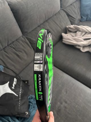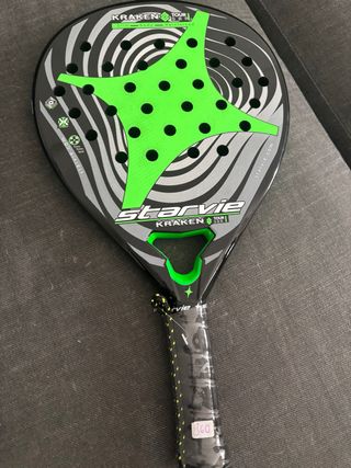 Pala de pádel Starvie Kraken Tour SBR con un diseño llamativo en negro, gris y verde. Es el modelo con la goma blanda de 30. Esta sin estrenar. - Forma de lágrima. - Rugoso acabado brillante. - Perfil de 26 ( mas fino de lo habitual). - Grip mas largo de lo habitual. - Muy manejable. - Peso 360gr. - Incluye funda. Posibilidades de cambio solo por Nox at10 18k o Bullpadel vertex hybrid.