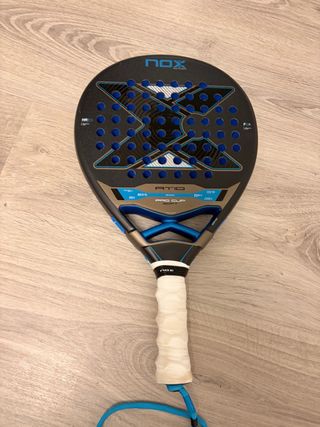 Pala de pádel Nox AT10 Pro Cup. Usada 2 veces y no me adapto ! Muy blanda - Diseño moderno con detalles en azul y negro. - Empuñadura blanca para un agarre cómodo. - Incluye cordón de seguridad azul.