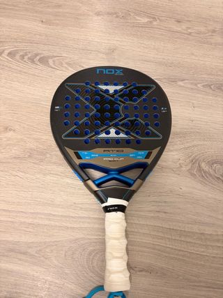 Nox Equation Advance Series World Padel Tour 2023 へ Material marco : 100% Carbono Material plano : Fibra de vidrio 3K Material goma : EVA HR3 Tacto : Medio-Blando Forma: Redonda Peso: 360-375 gramos La vendo por falta de uso, no tiene ninguna raja ni ningun golpe, en el marco principal le salto la pintura con el protector original