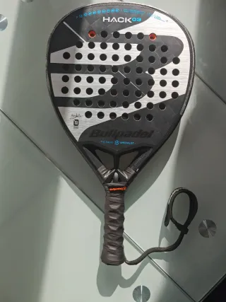 Pala de pádel Bullpadel Hack 03. - Diseño en color negro con detalles plateados. - Incluye funda protectora. - Mango con grip blanco. Tienes algunos roces en la parte exterior pero por el retro está perfecta, ni rajada ni nada por la parte del golpeo