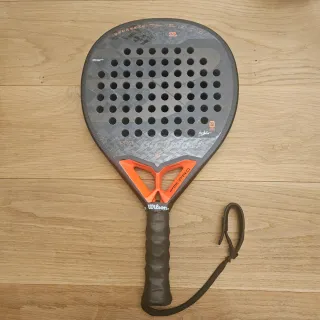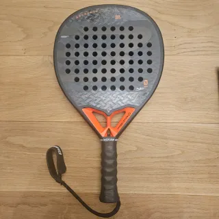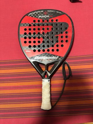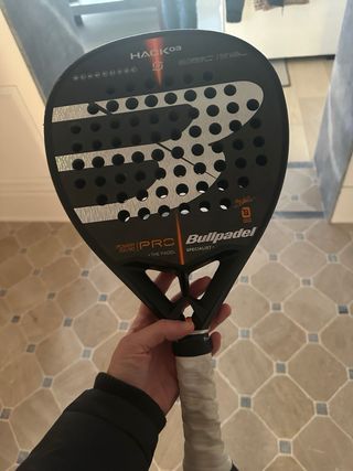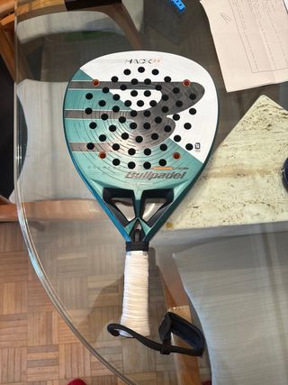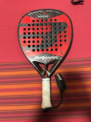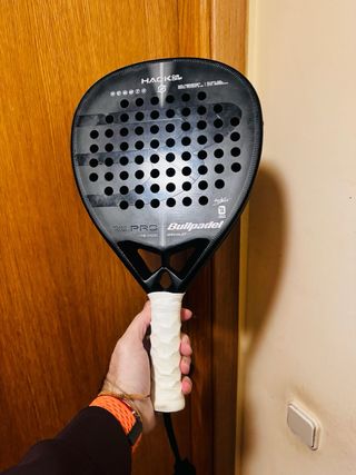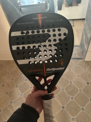 Pala de pádel Bullpadel Hack 03. Comprada en julio (incluyó justificante de compra) y usada en 4 partidos (demostrable con el perfil de playtomic). Peso: 367g La vendo porque no me acoplo a sus características de pala de potencia. Tiene un pequeño roce en un lateral que puedes ver en una de las fotografías. Lleva puesto un grip de Wilson. Te regalo uno nuevo a elegir entre blanco o negro de la misma marca.