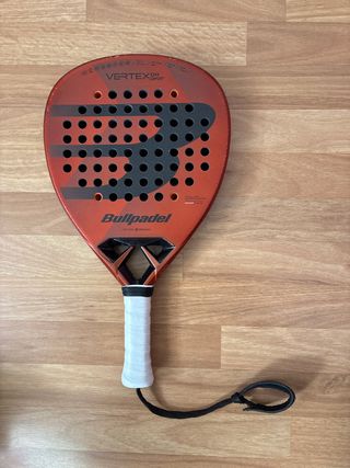 Pala de pádel Bullpadel Vertex 04 Comfort en color naranja y negro con grip a estrenar. 2 partidos jugados - Diseño con el logo de Bullpadel. - Superficie con agujeros. - Empuñadura blanca. - Correa de seguridad negra