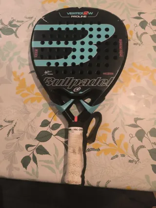Pala de pádel Bullpadel Vertex 2W Proline. - Diseño en negro y turquesa. - Logo de Bullpadel en el centro. - Grip blanco con detalles. - Agujeros en la cara de la pala. Una pala que lo ha dado todo, con varias grietas pero se puede reparar