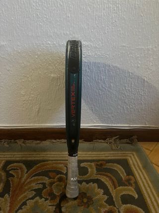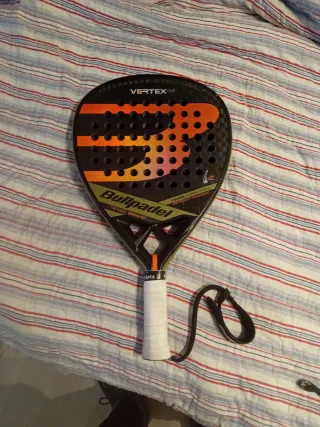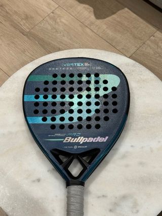 Pala de pádel Bullpadel Vertex 03. . Superficie con agujeros: Superficie rugosa carbono 4k . Empuñadura blanca: Overgrip anti shock y cubre grip blanco nuevo . Incluye cordón de seguridad: Incluye cordón de seguridad tipo pulsera ajustable. Pala de pádel que he usado solo dos veces, Tiene esas pequeñas marcas pero son de haberse rozado dentro del bolso.