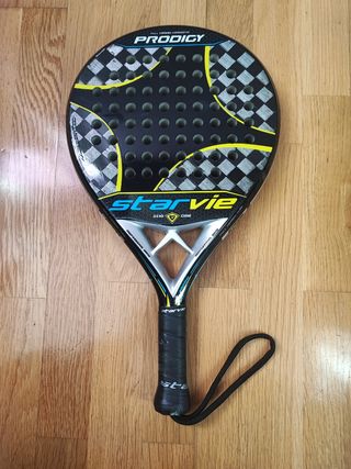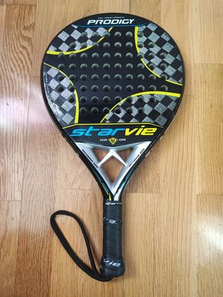 pala de pádel starvie prodigy, pesa 360 gramos, pala muy equilibrada de tacto medio-duro, con fibra de carbono aluminizado 21K y goma Eva muy cómoda, balance medio-alto, forma de lágrima, con buena salida de bola y excelente control, muy cómoda en defensa con mucho control y va muy bien en voleas profundas, bandejas y remates, muy cómoda en defensa y en ataque, es una pala que apenas se ve pero es un palón, sin apenas uso, prácticamente nueva a estrenar 2 partidos se ha usado. paddel, paddle, padell, padle, pádel head, asics, varlion, siux, drop shot, vision, orygen, wilson, adidas, star vie, kaitt, nox, dunlop, kombat, zyklon, g