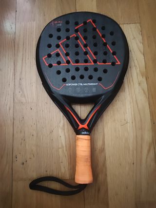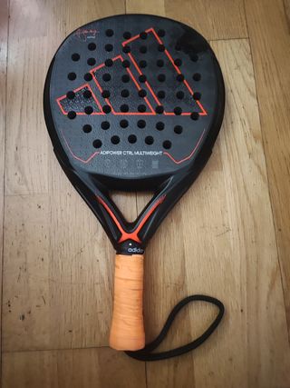 pala de padel Adidas adipower control multiweight de Ale Ruiz, pesa 360 gramos, con todos los tornillos, sin ellos pesa 345 gramos, pala muy equilibrada de tacto medio, con fibra de carbono 18K y goma Eva muy cómoda, balance medio, con muy buena salida de bola y excelente control, muy cómoda en defensa con mucho control y va muy bien en voleas profundas, bandejas y remates, los globos salen solos, tiene una reparación en el marco realizada en el club donde juego, poco uso. paddel, paddle, padell, padle, pádel head, asics, varlion, siux, drop shot, orygen, wilson, adidas, star vie, nox, dunlop, kombat, gf padel, viper, babolat