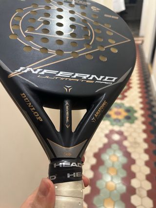 Pala de pádel Dunlop Inferno Ultimate Pro. - Diseño en negro con detalles dorados y plateados. - Logo de Dunlop en el corazón de la pala. - Inscripción Tribar en el puente. - Anatomic Construction en el lateral. - tiene fisura para arreglar