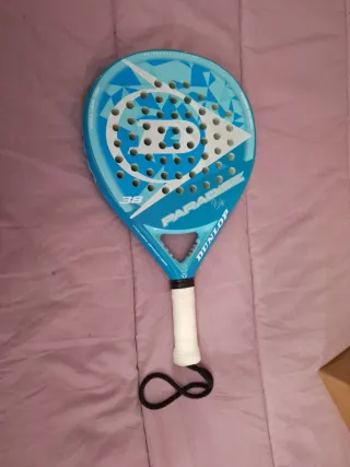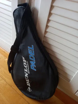 Se vende pala de pádel Dunlop con su funda. - Pala con diseño en azul, negro y plateado. - Funda a juego con rayas azules y negras. - Incluye correa para la funda.