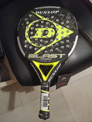 Pala de pádel Dunlop Blast Pro Juani Mieres. Tiene un pequeño descorchón de pintura en el cuadro de la pala como se ve en la foto, es solo pintura. - Diseño con triple capa. - Marco Aeroframe. - Acabado en negro y amarillo. - Forma: Redonda - Peso: 367g