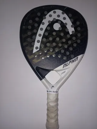 Pala de pádel Head Alpha Pro en color blanco y negro. - Tiene 2 roturas pequeñas , se puede reparar - Diseño con el logo de Head. - Superficie con agujeros. - Grip blanco.
