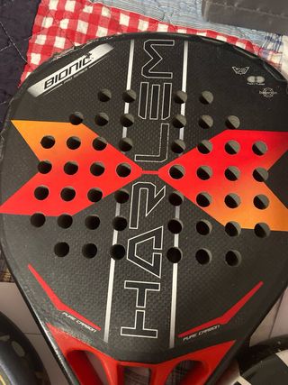 Pala de pádel Bullpadel MM1 pro bien cuidada siempre en funda y sin cambios de temperatura(usada como segunda pala). Roces del juego sin ninguna raja , lo que se ve en las fotos son roces del cristal sin importancia alguna, para el juego no afecta en nada. Viene con Hesacore y shockout incluidos . No leer: * Adidas , Head , Nox , Kombat , Babolat , Wilson , Nike