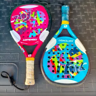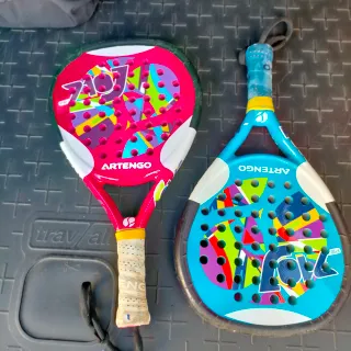 Dos palas de pádel infantiles de la marca Artengo, ideales para iniciarse en el deporte. - Diseño colorido y llamativo. - Empuñadura cómoda para manos pequeñas. - Agujeros en la cara para mayor control.