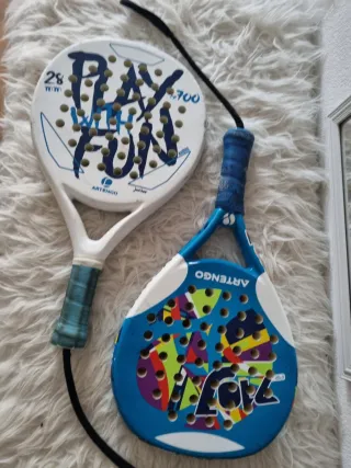 Dos palas de pádel infantiles de la marca Artengo. Ideales para iniciarse en el deporte. - Pala blanca con diseño Play with Fun. - Pala azul con diseño colorido y moderno. - Incluyen cordón de seguridad. 15€ las 2. 8€ cada una
