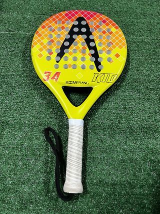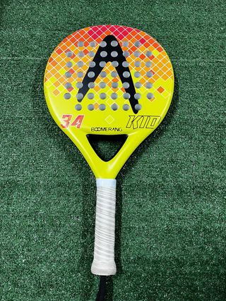 Pádel infantil de la marca Boomerang, modelo Kid 34. - Pala de pádel de color amarillo. - Diseño con detalles en rojo y naranja. - Empuñadura blanca.