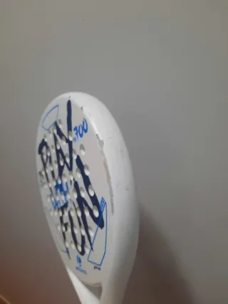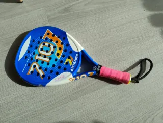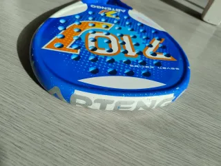 Pala de pádel Artengo para iniciación. - Modelo: PR 700. - Diseño: Play with fun. - Tamaño: 28 mm. - Color: Blanco y azul. En las fotos puedes ver los roces que tiene.