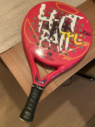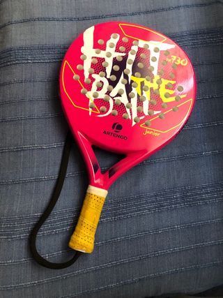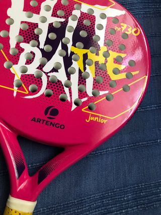 Pala de pádel junior de la marca Artengo, modelo HIT BALL PR 730. - Pala de color rosa con detalles en amarillo y blanco. - Diseño con agujeros en la cara. - Empuñadura negra nueva. - Indicada para jugadores junior.