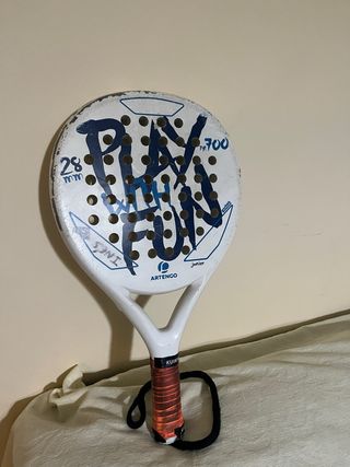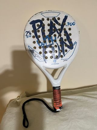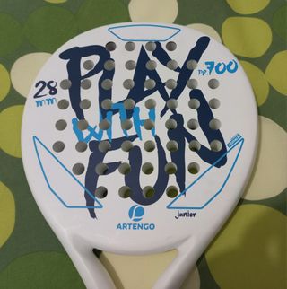 Pala de pádel Artengo para iniciación. - Modelo: PR 700. - Diseño: Play with fun. - Tamaño: 28 mm. - Color: Blanco y azul. En las fotos puedes ver los roces que tiene.