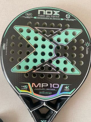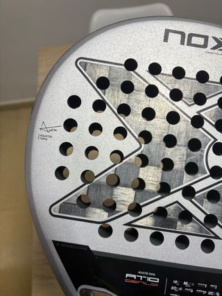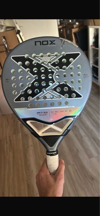 Pala de pádel Nox AT10. Pala de pádel Nox , tiene una raja en la parte superior de una de sus caras, aun así se puede usar para jugar Se aceptan cambios