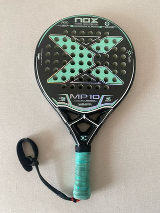 Pala de pádel NOX MP10 de la Luxury Series. - Diseño con acabado en negro y detalles en verde menta. - Superficie con patrón de agujeros. - Incluye correa de seguridad. - Mango con grip de color verde menta.