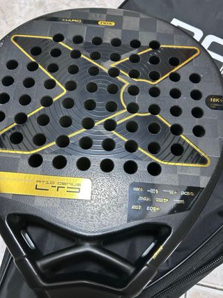 Pala de pádel Nox AT10 Agustín Tapia Luxury Genius. Se ha usado muy poco. Tiene algún arañazo sin llegar a ser golpe o hendidura profunda - Diseño con acabado mate. - Marco de carbono. - Núcleo de goma Black EVA. - Superficie de fibra de carbono 18K.