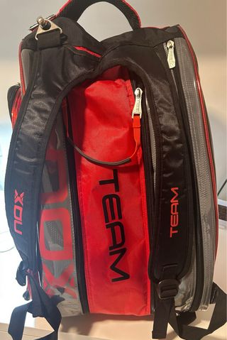 Paletero de pádel Nox AT10, diseñado en colaboración con Agustin Tapia. - Compartimentos amplios para equipación. - Bolsillo específico para palas. - Correa ajustable para el hombro. - Etiqueta original incluida.