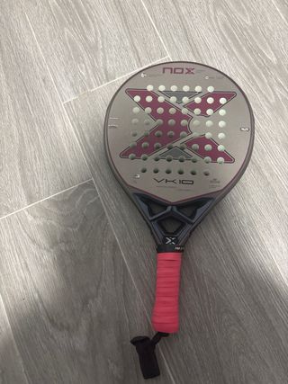 Pala de pádel Nox VK10 con diseño moderno. - Color gris y rosa. - Forma redonda. - Acabado mate.