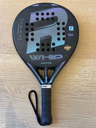 Pala de pádel Royal Padel Whip . - Diseño en color gris con detalles en rosa y azul. - Logo grande R en negro y detalles gráficos. - Inscripción LIGHT en la parte superior. - Inscripción ROYAL PADEL y WHIP en la cara. - Tecnología NEW MILLENNIUM ROYAL TECH CONTROL CORE 2.0. - Inscripción Since 1991 y 3D en la cara. Pvp 280 precio liquidacion 135