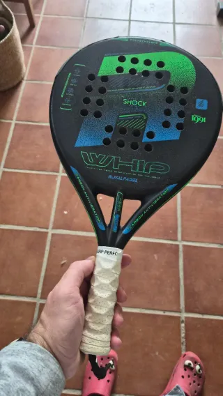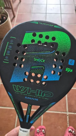 Pala de pádel Royal Padel modelo Whip. - Marco con tecnología Carbon Antivibration. - Núcleo Shock Point con Polyethylene y Fiber Tech. - Diseño con detalles en verde y azul. - Incluye grip hexacore y 4 overgrips para cambiar. -Usada y con algún arañazo de pared pero le quedan muchos partidos. - La mejor pala para el codo de tenis o epicondilitis
