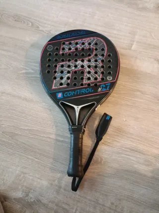 Pala de pádel Royal Padel, modelo R Control M27. - Pala de pádel para adulto. - Diseño en color negro con detalles en rosa y azul. - Incluye correa de seguridad negra.