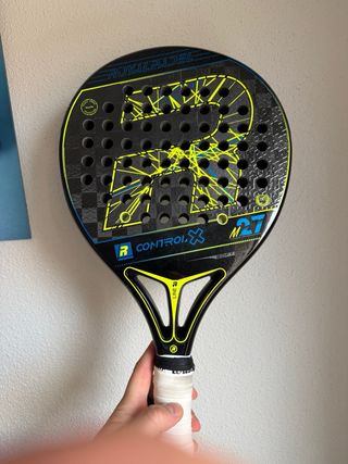 Pala de pádel Royal Padel modelo M27 Control X. - Diseño en negro con detalles en amarillo y azul. - Logo de Royal Padel en grande en el centro. - Nombre del modelo 'Control X' visible. Usada pero en buenas condiciones, tiene ese tique que se ve en la ultima foto, pero q no afecta para nada a la estructura de la pala. De ahí tmb el precio, no esta perfecta.