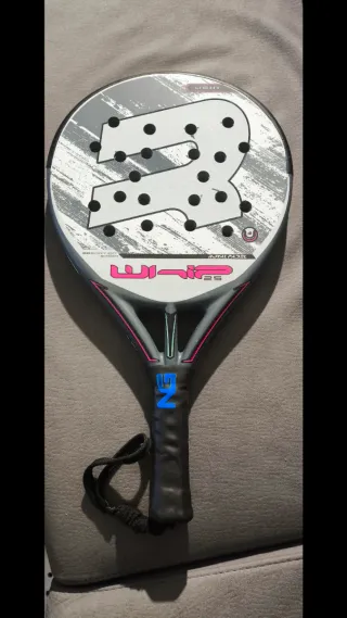 Pala de pádel Royal Whip Light 25 en excelente estado, casi nueva. - Diseño moderno en gris, negro y detalles en rosa. - Incluye cordón de seguridad negro.