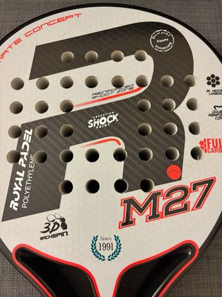 Pala de pádel Royal Padel M27 Carbon Serie 2020. - Pala de pádel con núcleo de polietileno. - Diseño Ultimate Concept. - Tecnología Shock Point. - Logo de Royal Padel España Barcelona.