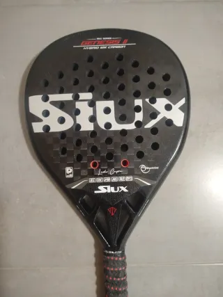 Pala de padel Siux Pegasus Revolution 3K del 2024,la pala esta aun para jugar tiene una pequeña rotura en una esquina como se puede apreciar en la foto,pero se puede reparar,no afecta en el juego, protector transparente, una pala con poco peso pero con buena salida de bola y bastante adaptable para defensa y ataque.