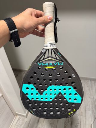 Pala de pádel Varlion Maxima con diseño moderno y llamativo. - Color negro con detalles en turquesa y amarillo. - Superficie con agujeros. - Grip blanco. -Usada año y medio -Tiene algun desperfecto en las gomas y la cuerda esta para cambiar