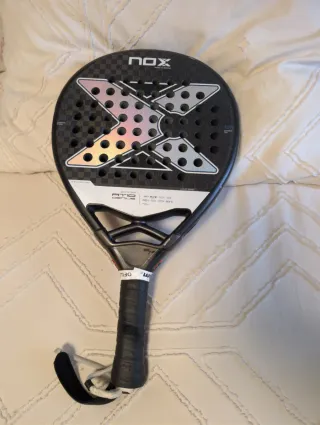 Pala de pádel con diseño moderno y llamativo. - Pala de pádel NOX AT 10 el modelo 12k, es más fácil de usar - Diseño en forma de lágrima - Acabado en negro con textura de carbono, las caras son rugosas. - Incluye correa de seguridad en el mango. Los roces que se ven en las fotos, son eso roces, no tiene ninguna fisura y las caras están perfectas. No leer Bullpadel, Head, víbora, nox, adidas