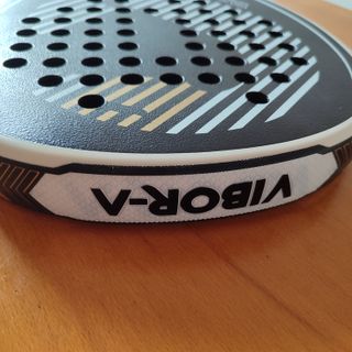 Pala de pádel Vibor-A Mamba Black con acabado en carbono. Tiene un desperfecto, ver detalle en las fotos. Funciona perfectamente. - Diseño en negro y amarillo. - Logo de Vibor-A en el centro. - Grip blanco. - Cordón de seguridad negro.