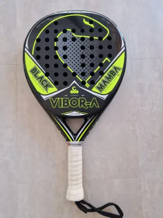 Pala de pádel Vibor-A Black Mamba. - Diseño en color negro con detalles en amarillo. - Incluye dos protectores de pala amarillos. - usado en 5 partidos , no me adpto a ella
