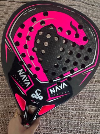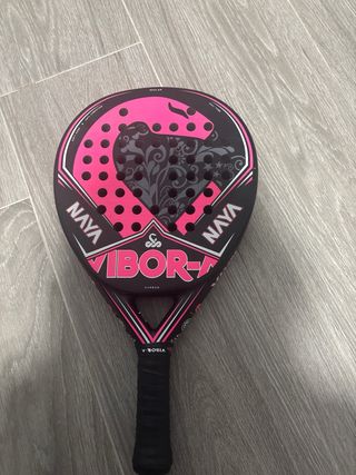 Pala de pádel Vibor-A Naya con acabado en carbono. Diseño llamativo en negro y rosa. - Marco y caras con detalles en rosa. - Empuñadura negra. - Incluye cordón de seguridad. Tengo Dos iguales