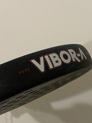 Pala de pádel VIBOR-A Yarara. Tiene una grieta en la cara , pero no afecta al juego. - Diseño con acabado en carbono. - Detalles en color dorado y rojo. - Logo de la marca VIBOR-A. - Incluye funda protectora.